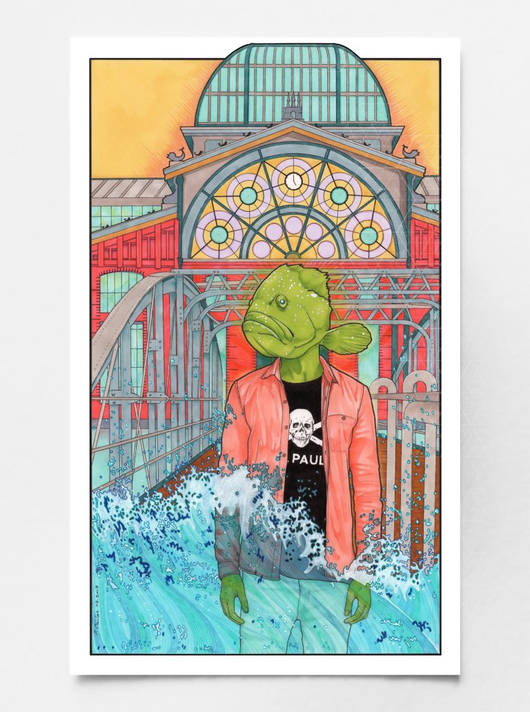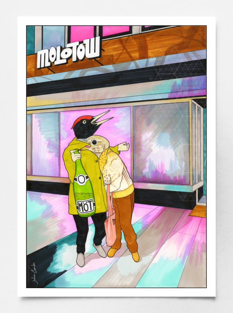 Illustrationsserie über Hamburg: Metaphern in Tiergestalt an bekannten Orten in Hamburg, wie der Speicherstadt, dem Fischmarkt, den Clubs Molotov und Goldenpuddelclub. Realisiert mit Alkoholstiften, Tinte und Buntstiften auf Papier.